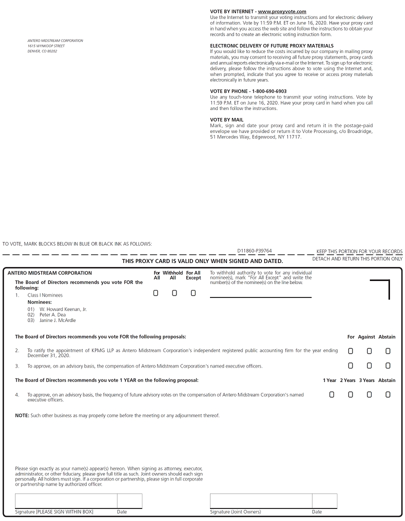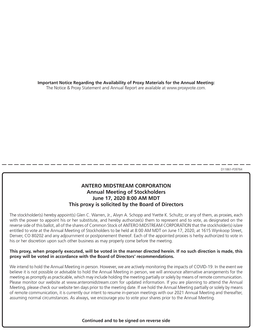 | 1. | Elect the three Class I members of Antero Midstream Corporation’s Board of Directors (the “Board”) named in this Proxy Statement to serve until Antero Midstream’s 2023 Annual Meeting of Shareholders; |