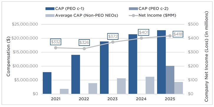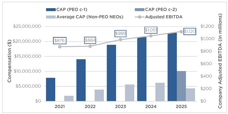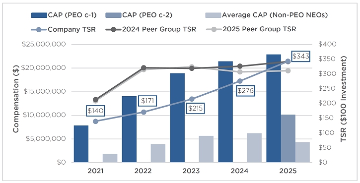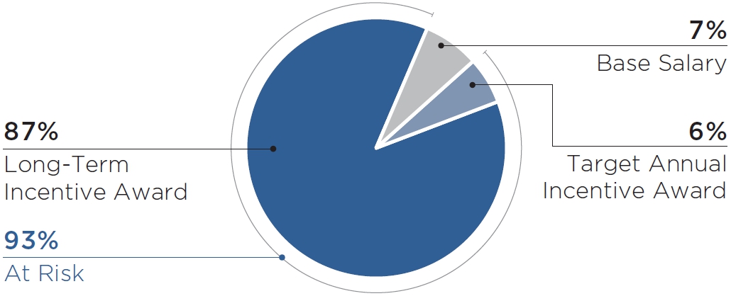 | • | Long-term incentive compensation awards were 75% time-based equity awards and 25% performance-based equity awards to our Named Executive Officers in March 2025. All long-term incentive awards vest over several years to reward sustained Company performance over time. | |