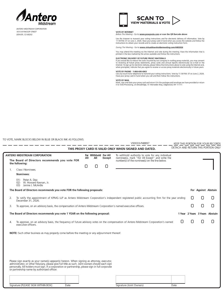 ANTERO MIDSTREAM CORPORATION 1615 WYNKOOP STREET DENVER, CO 80202SCAN TO VIEW MATERIALS & VOTE VOTE BY INTERNET Before The Meeting - Go to www.proxyvote.com or scan the QR Barcode above Use the Internet to transmit your voting instructions and for electronic delivery of information. Vote by 11:59 P.M. ET on June 2, 2026. Have your proxy card in hand when you access the website and follow the instructions to obtain your records and to create an electronic voting instruction form. During The Meeting - Go to www.virtualshareholdermeeting.com/AM2026 You may attend the meeting via the Internet and vote during the meeting. Have the information that is printed in the box marked by the arrow available and follow the instructions. ELECTRONIC DELIVERY OF FUTURE PROXY MATERIALS If you would like to reduce the costs incurred by our company in mailing proxy materials, you may consent to receiving all future proxy statements, proxy cards and annual reports electronically via e-mail or the Internet. To sign up for electronic delivery, please follow the instructions above to vote using the Internet and, when prompted, indicate that you agree to receive or access proxy materials electronically in future years. VOTE BY PHONE - 1-800-690-6903 Use any touch-tone telephone to transmit your voting instructions. Vote by 11:59 P.M. ET on June 2, 2026. Have your proxy card in hand when you call and then follow the instructions. VOTE BY MAIL Mark, sign and date your proxy card and return it in the postage-paid envelope we have provided or return it to Vote Processing, c/o Broadridge, 51 Mercedes Way, Edgewood, NY 11717. TO VOTE, MARK BLOCKS BELOW IN BLUE OR BLACK INK AS FOLLOWS: V93033-P48897 KEEP THIS PORTION FOR YOUR RECORDS THIS PROXY CARD IS VALID ONLY WHEN SIGNED AND DATED. DETACH AND RETURN THIS PORTION ONLY ANTERO MIDSTREAM CORPORATION The Board of Directors recommends you vote FOR the following: For Withhold For All All All Except To withhold authority to vote for any individual nominee(s), mark "For All Except" and write the number(s) of the nominee(s) on the line below 1. Class I Nominees. Nominees: 01) Peter A. Dea 02) W. Howard Keenan, Jr. 03) Janine J. McArdle The Board of Directors recommends you vote FOR the following proposals: 2. To ratify the appointment of KPMG LLP as Antero Midstream Corporation's independent registered public accounting firm for the year ending December 31, 2026. 3. To approve, on an advisory basis, the compensation of Antero Midstream Corporation's named executive officers. The Board of Directors recommends you vote 1 YEAR on the following proposal: 4. To approve, on an advisory basis, the frequency of future advisory votes on the compensation of Antero Midstream Corporation's named executive officers. NOTE: Such other business as may properly come before the meeting or any adjournment thereof. For Against Abstain 1 Year 2 Years 3 Years Abstain Please sign exactly as your name(s) appear(s) hereon. When signing as attorney, executor, administrator, or other fiduciary, please give full title as such. Joint owners should each sign personally. All holders must sign. If a corporation or partnership, please sign in full corporate or partnership name by authorized officer. Signature [PLEASE SIGN WITHIN BOX] Date Signature (Joint Owners) Date